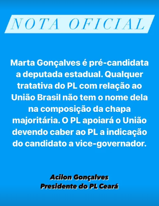 No documento, Acilon negou que a pré-candidata a deputada estadual, Marta Gonçalves, não será a vice de Wagner. “Marta Gonçalves é pré-candidata a deputada estadual. Qualquer tratativa do PL com relação ao União Brasil não tem o nome dela na composição da chapa majoritária. O PL apoiará o União devendo caber ao PL a indicação do candidato a vice-governador.”