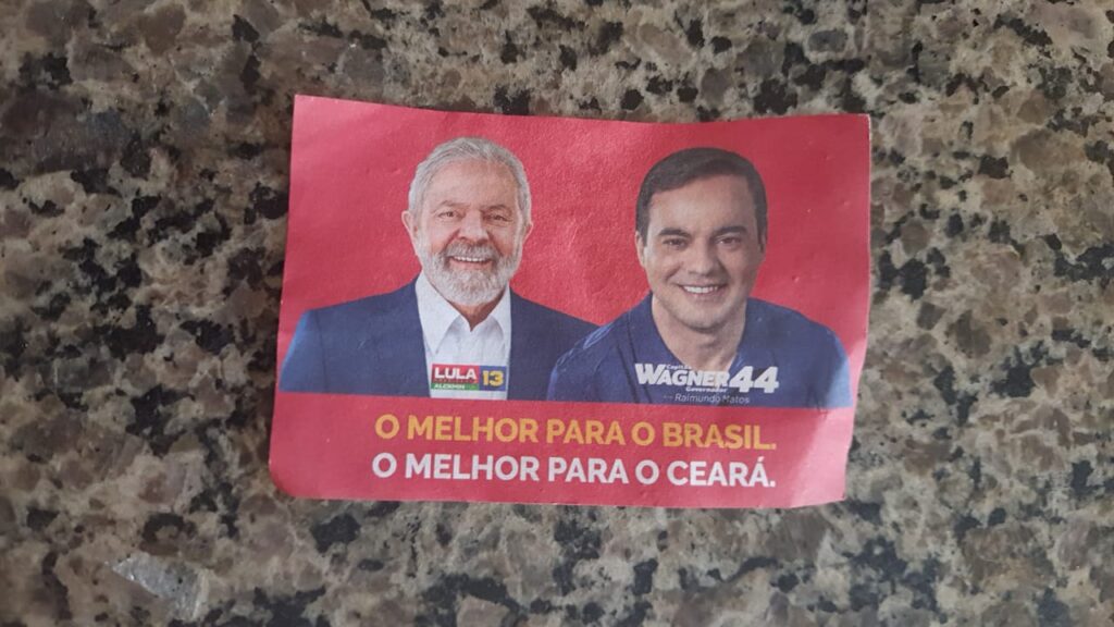 O material gráfico traz Lula e Wagner lado a lado, indica os números dos dois e o texto: “O melhor para o Brasil. O melhor para o Ceará”. Na parte posterior do santinho, a indicação para votar no candidato do União Brasil para governador e em Lula para presidente.