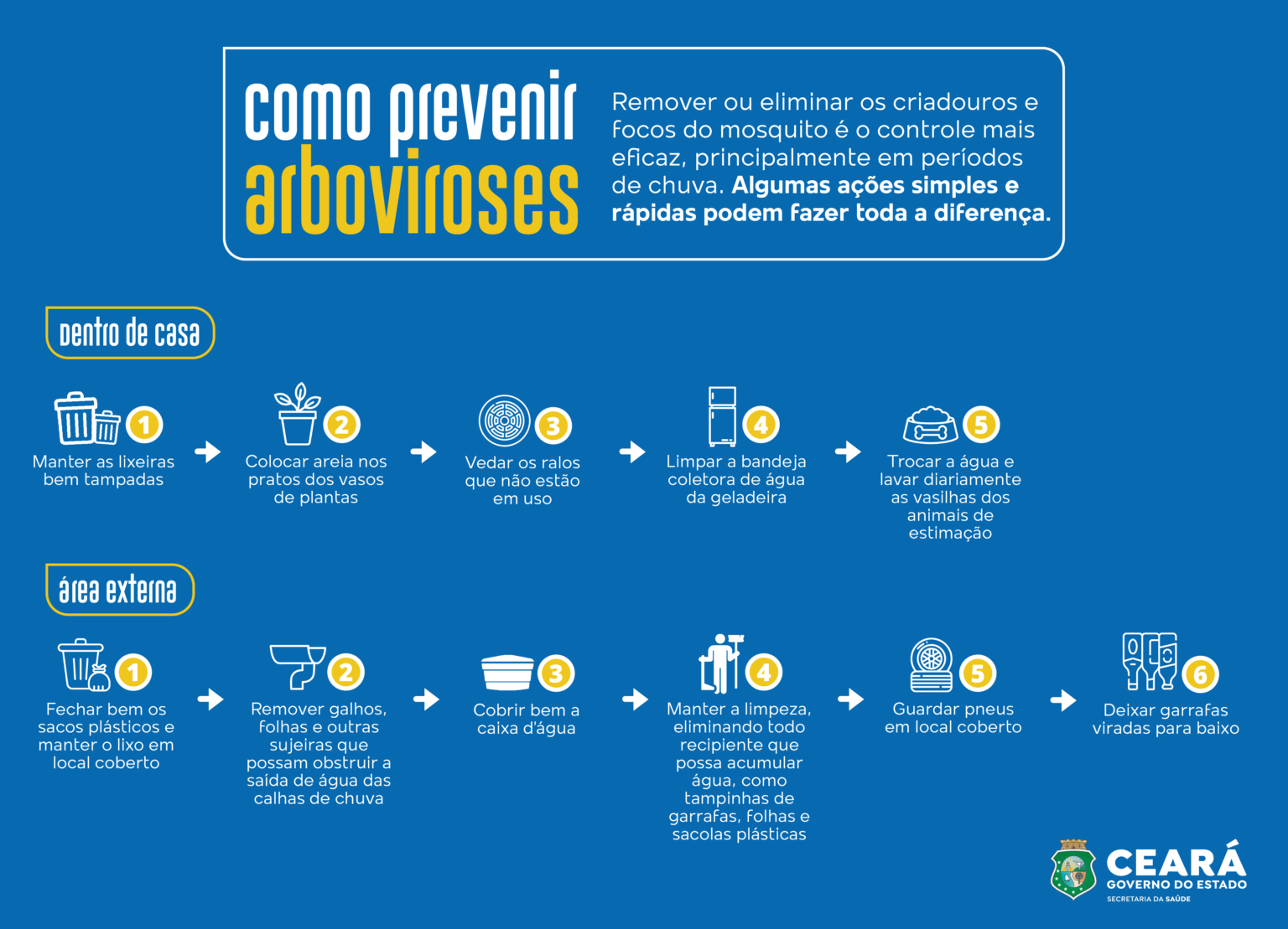 A coordenadora de Vigilância Ambiental e Saúde do Trabalhador (Covat), Roberta de Paula, reforça a importância da prevenção também no período pós-chuvas. “Nos próximos meses, a tendência é de que as chuvas percam a intensidade, favorecendo a reprodução dos vetores. É hora de eliminar os reservatórios desprotegidos com água acumulada, um dos pontos de reprodução dos mosquitos”, disse. A quadra chuvosa no Ceará ocorre entre os meses de fevereiro e maio. Roberta frisa ainda cuidados básico, como limpar o quintal e vedar caixas d’água na prevenção contra o mosquito da Dengue, o Aedes aegypti.
