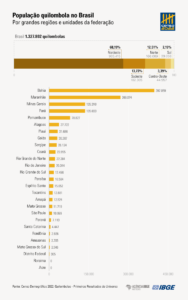 Conforme o ranking do levantamento, a Bahia é a Unidade da Federação com maior quantidade de quilombolas: 397.059 pessoas, ou 29,90% da população quilombola recenseada. Em seguida, vem o Maranhão, com 20,26% dessa população (ou 269.074 pessoas quilombolas). Juntos, os dois estados concentram metade (50,16%) da população quilombola do país. A seguir, vêm Minas Gerais (135.310), Pará (135.033) e Pernambuco (78.827) que, somados, reúnem 26,3% da população quilombola.