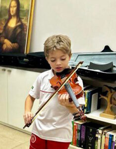 Matteo Bellucci, um menino italiano com coração brasileiríssimo, é apaixonado por violino. O contato com a música clássica começou na vida intrauterina. “Quando engravidei, li uma matéria sobre a importância de colocar música clássica para o bebê na barriga e ao longo da primeira infância. Então sempre levei para concertos tanto na Itália quanto no Brasil”, conta Afra Bellucci, mãe de Matteo. O estímulo, somado a uma vocação natural, fez com que o próprio menino pedisse para aprender a tocar. As aulas começaram há poucos meses e o encantamento só aumenta. “Eu sinto amor. Eu gosto do som. É como se fosse amor mesmo”, diz Matteo.