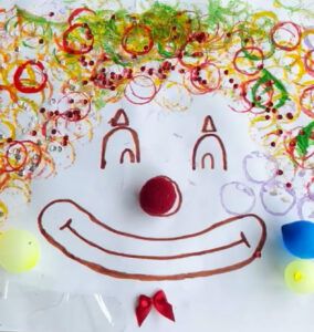 Desenhe um palhaço de forma simples mesmo. Dois arcos para os olhos, um círculo para o nariz e uma boquinha sorrindo. Depois, convide a criança para mergulhar o rolo de papel na tinta e ir fazendo círculos no papel. O rolo funciona como uma espécie de carimbo. Esses círculos vão formar o cabelo do palhaço. Depois é só decorar com as lantejoulas e lacinhos pra ficar bem colorido e divertido.