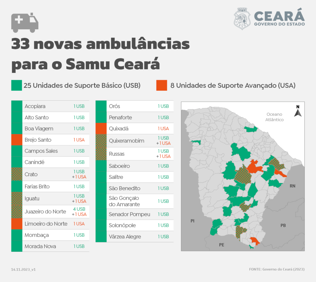 O Ceará recebeu nesta terça-feira (14) 33 novas ambulâncias do Serviço de Atendimento Móvel de Urgência (Samu 192). Agora, 25 municípios contam com os novos equipamentos, destinados pelo Ministério da Saúde (MS) ao Ceará, e entregues pelo governador Elmano de Freitas (PT). Com investimento superior a R$ 9 milhões, a frota agora entregue tem 25 ambulâncias do tipo Unidade de Suporte Básico (USB) e oito do tipo Unidade de Suporte Avançado (USA), a Unidade de Terapia Intensiva (UTI) Móvel. Em janeiro deste ano, o Estado já havia entregue 20 novos veículos, além de mais sete ao longo do primeiro semestre. Com isso, o total da frota no Ceará é de 166 veículos de socorro, sendo 160 ambulâncias, três motolâncias e três aeromédicos.