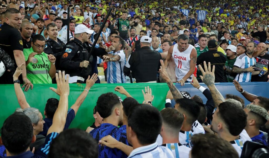 Uma briga entre torcedores de Brasil e Argentina atrasou o início da partida entre as duas seleções, na noite desta terça-feira (21). O confronto começou no Setor Sul do Maracanã, palco da partida, durante a execução do hino argentino. O jogo é válido pela 6ª rodada das Eliminatórias Sul-americanas para a Copa do Mundo de 2026.