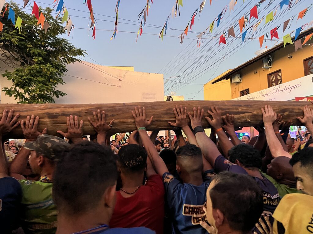 Ao mesmo tempo que o calor aumenta, um grupo de crianças faz o seu próprio cortejo do pau da bandeira. Diferente de um tronco pesado, os meninos e meninas erguem um feito de metalon, papel panamá e papelão reforçado, que formam uma réplica do mastro oficial. Esse momento já acontece há mais de 21 anos. “É daqui que sairão alguns que vão manter essa tradição, os futuros carregadores de pau”, explica o gestor escolar e criador deste costume infantil, Diego Alves de Souza.
