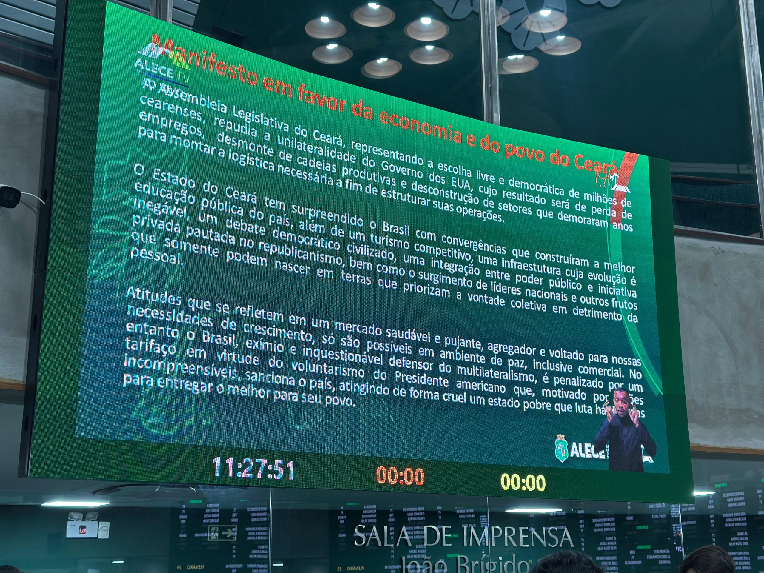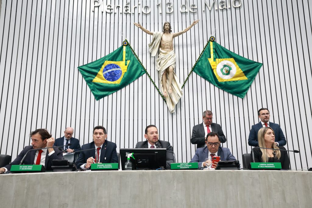 A Mesa Diretora da Assembleia Legislativa do Ceará (Alece) leu, na abertura dos trabalhos legislativos para o segundo semestre, ocorrido na manhã desta terça-feira (5), um manifesto, intitulado “Manifesto em favor da economia e do povo do Ceará”, contra o tarifaço imposto pelo governo dos EUA, assinado pelo presidente Donald Trump, a produtos brasileiros.