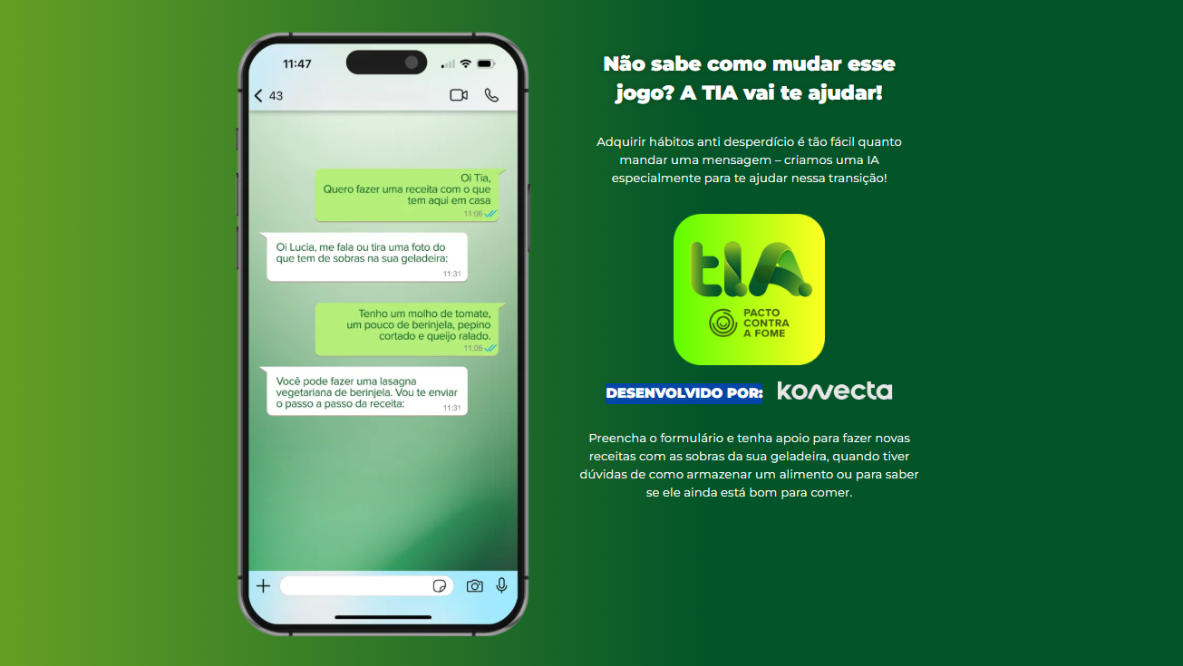Batizada de TIA Contra a Fome, a assistente virtual orienta os usuários com dicas práticas para reduzir o desperdício dentro de casa. Pelo WhatsApp, ela também sugere receitas a partir dos ingredientes disponíveis na geladeira, ajudando, na prática, famílias a transformar sobras em novas refeições.