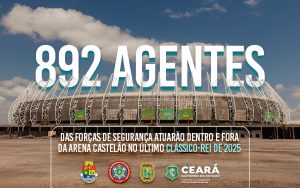 O Clássico-Rei entre Ceará e Fortaleza, válido pela 32ª rodada da Série A do Campeonato Brasileiro, contará com ampla mobilização das forças vinculadas à Secretaria da Segurança Pública e Defesa Social (SSPDS) e órgãos parceiros. A partida, marcada para as 20 horas desta quinta-feira (6), reunirá 892 agentes atuando dentro e fora da Arena Castelão.