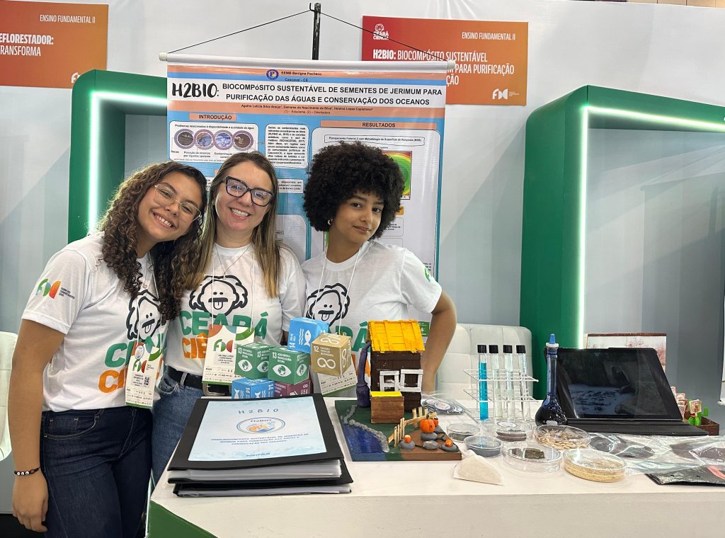 Com orientação da professora de Biologia Heloina Capistrano, as jovens estudantes da Escola de Educação Básica Municipal Benigna Pacheco, Damares do Nascimento (15) e Ágatha Letícia (14) criaram o projeto “H2BIO: biocompósito sustentável da semente do jerimum para a purificação de águas e conservação dos oceanos”.