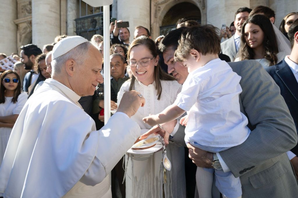 O casal havia se inscrito previamente para o momento reservado a autoridades e famílias, com um desejo claro: receber a bênção do pontífice para o filho.