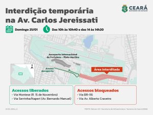 A Secretaria da Infraestrutura do Ceará (Seinfra) informou que a Avenida Carlos Jereissati, conhecida como Avenida do Aeroporto, terá interdição total e temporária neste domingo (25) nos dois sentidos da via. A medida ocorre para a execução de uma etapa necessária das obras da nova linha do veículo leve sobre trilhos (VLT) Aeroporto–Castelão.