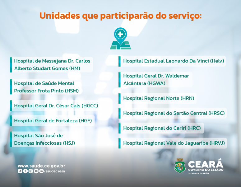 Os usuários são informados pelo aplicativo sobre a data e o horário do atendimento, o nome da especialidade e o local da consulta. Inicialmente, durante a fase de teste, o serviço contemplou o Hospital São José (HSJ) e o Hospital Estadual Leonardo da Vinci (Helv). A partir desta semana, outras nove unidades, localizadas em Fortaleza e no interior, serão integradas à iniciativa.