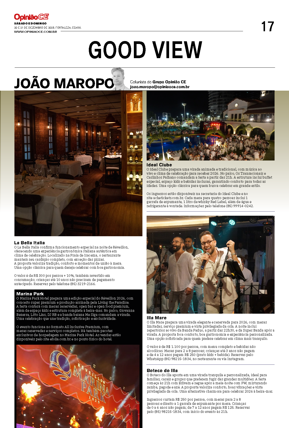 Ingressos custam R$ 250 por pessoa, com mesas para 2 a 8 pessoas e direito a 1 garrafa de espumante por mesa. Crianças de 0 a 6 anos não pagam; de 7 a 12 anos pagam R$ 125. Reservas pelo (85) 98215-1834, com início do evento às 21h.