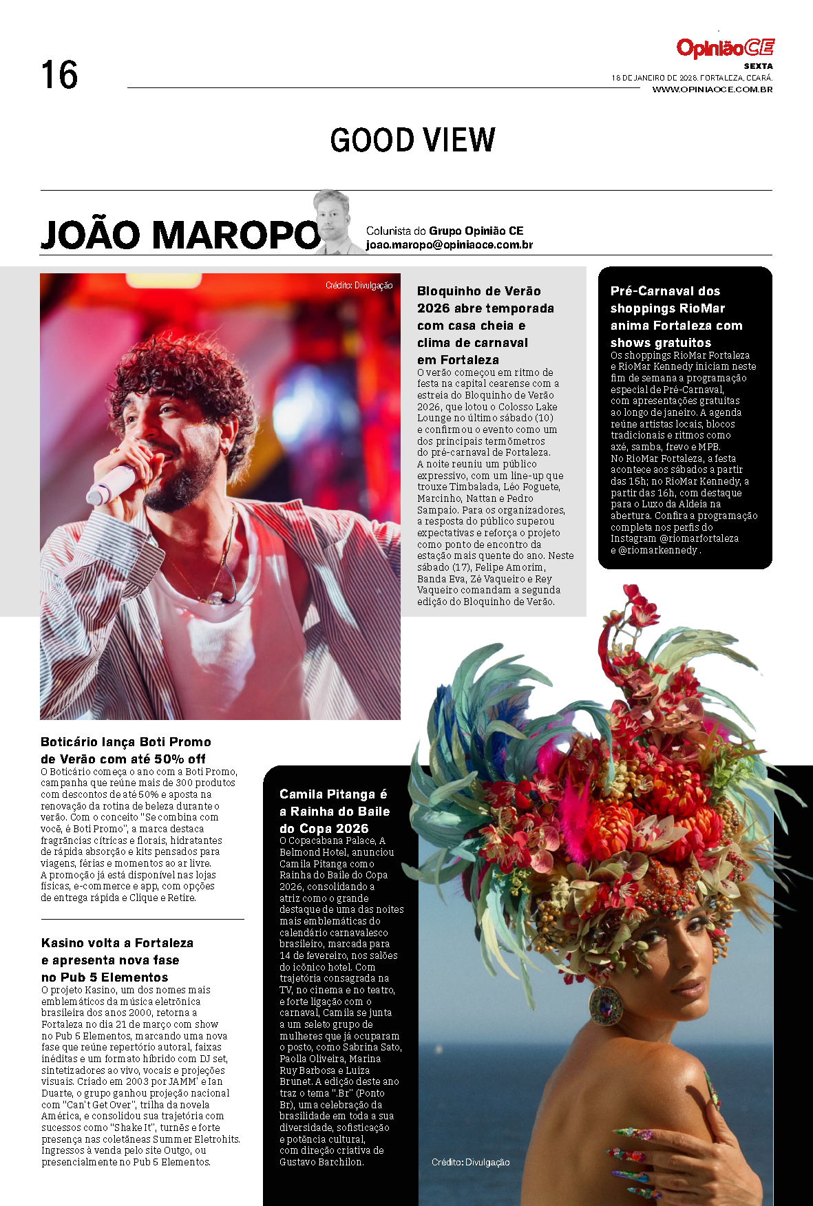 O Copacabana Palace, A Belmond Hotel, anunciou Camila Pitanga como Rainha do Baile do Copa 2026, consolidando a atriz como o grande destaque de uma das noites mais emblemáticas do calendário carnavalesco brasileiro, marcada para 14 de fevereiro, nos salões do icônico hotel. Com trajetória consagrada na TV, no cinema e no teatro, e forte ligação com o carnaval, Camila se junta a um seleto grupo de mulheres que já ocuparam o posto, como Sabrina Sato, Paolla Oliveira, Marina Ruy Barbosa e Luiza Brunet. A edição deste ano traz o tema “.Br” (Ponto Br), uma celebração da brasilidade em toda a sua diversidade, sofisticação e potência cultural, com direção criativa de Gustavo Barchilon.