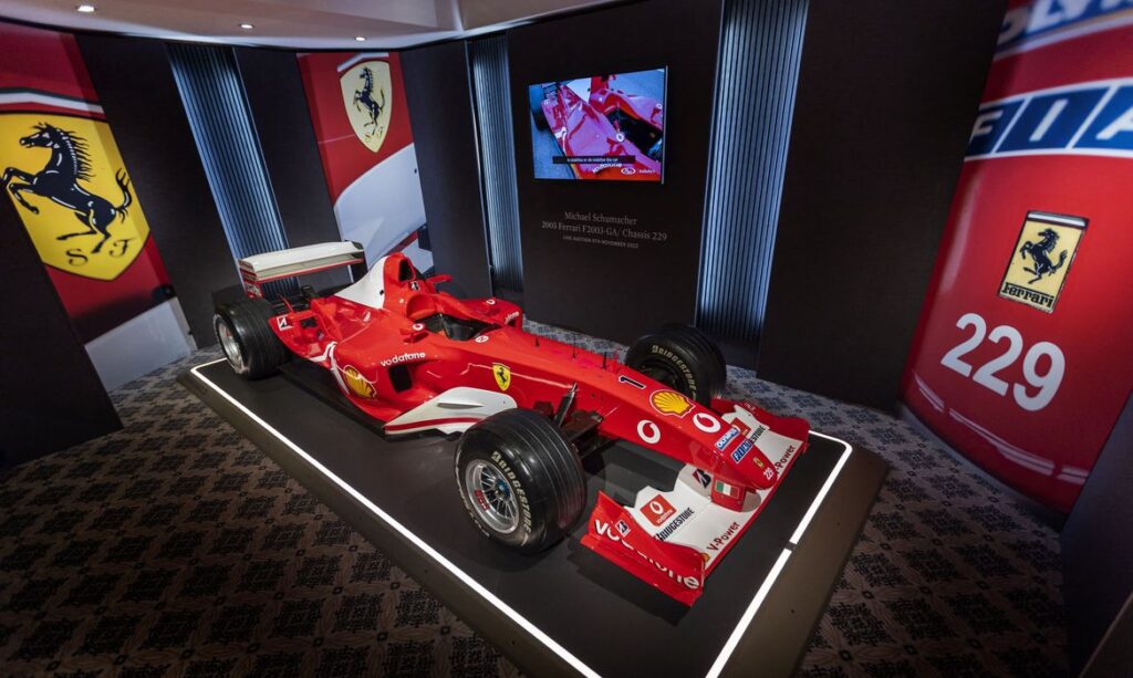De acordo com a casa de leilões Sotheby’s, um carro da Ferrari que foi utilizado por Michael Schumacher em cinco vitórias durante a temporada de 2023 da Fórmula 1, ano que o piloto alemão se sagrou campeão, será leiloada em Genebra na próxima semana.