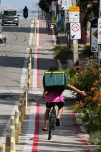 “Essa integração ocorre com os ônibus – por meio das faixas exclusivas, dos BRTs (Bus Rapid Transit) e dos corredores exclusivos –, com os ciclistas – com as ciclofaixas e as ciclovias – e com os pedestres – com o alargamento das calçadas, o fechamento de rua só para pedestres, as faixas de pedestres diagonais. São todas estruturas que vão tentando condicionar os usuários a uma nova prática cidadã do convívio”, aponta Queiroz.