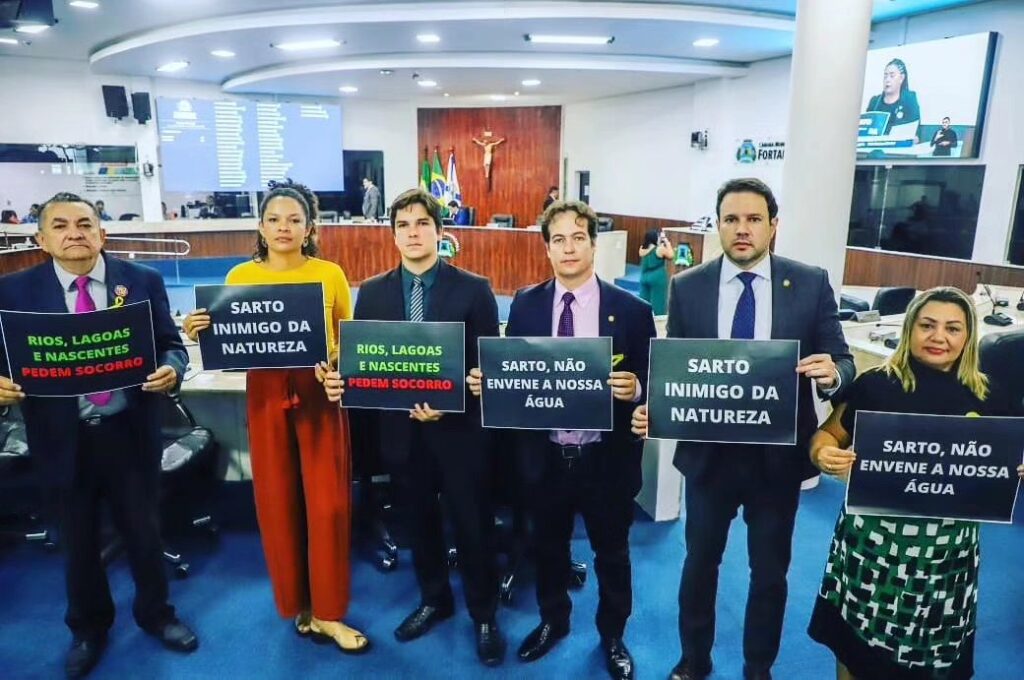Na sessão na Alece, os parlamentares portaram cartazes com críticas ao prefeito de Fortaleza, José Sarto (PDT): “Rios, lagoas e nascentes pedem socorro” e “Sarto, não envenene a nossa água”.