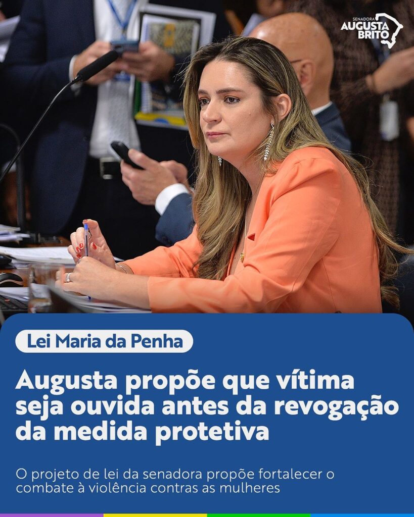 Um Projeto de Lei (PL) de autoria da senadora cearense Augusta Brito (PT) pretende fazer com que vítimas de violência contra a mulher sejam ouvidas antes da revogação da medida protetiva. Tal medida, segundo a parlamentar, seria para as mulheres manifestarem se ainda há o risco de violência antes da medida de segurança não valer mais. Conforme Augusta, o projeto alteraria a Lei Maria da Penha para “garantir mais segurança jurídica” às mulheres.